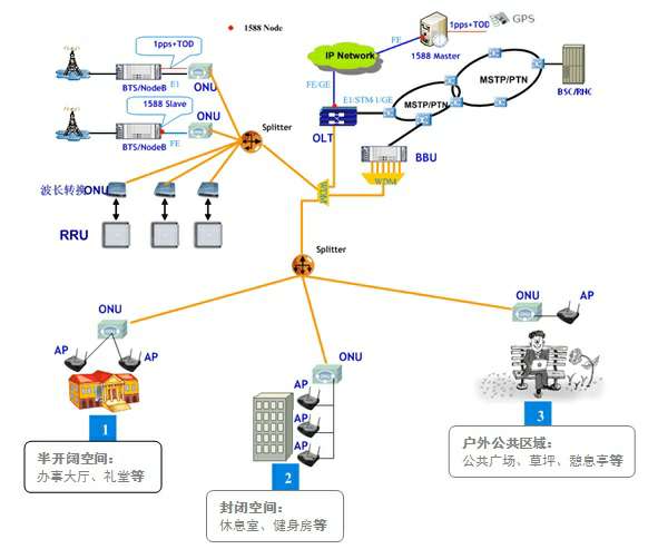 智慧社区无线WIFI及3G/4G网络覆盖也可采用GPON网络,通过波分复用的方式加载3G/4G信号源,在终端通过连接至ONU的无线AP或小区自建基站,将无线WIFI信号、3G/4G信号覆盖到整个社区,做到无线信号无死角,在任何地方都可以享受无线WIFI及3G/4G网络带来的极速体验。
